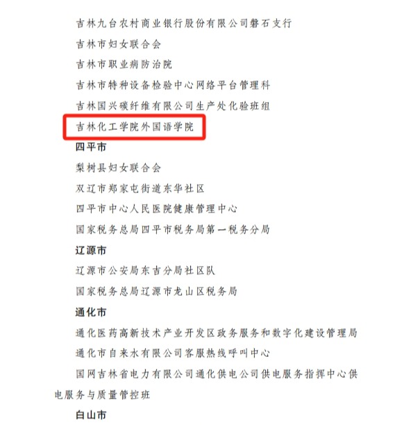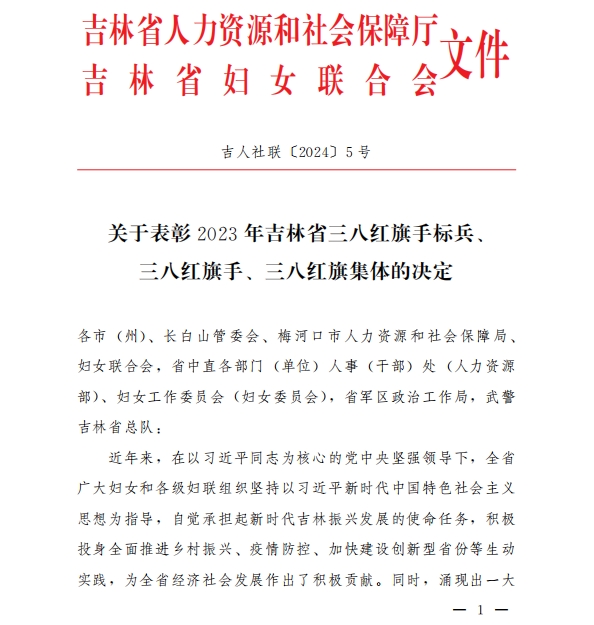 1月15日,吉林省人力资源和社会保障厅、吉林省妇女联合会发布《关于表彰2023年吉林省三八红旗手标兵、三八红旗手、 三八红旗集体的决定》,学校外国语学院荣获2023年吉林省三八红旗集体荣誉称号。