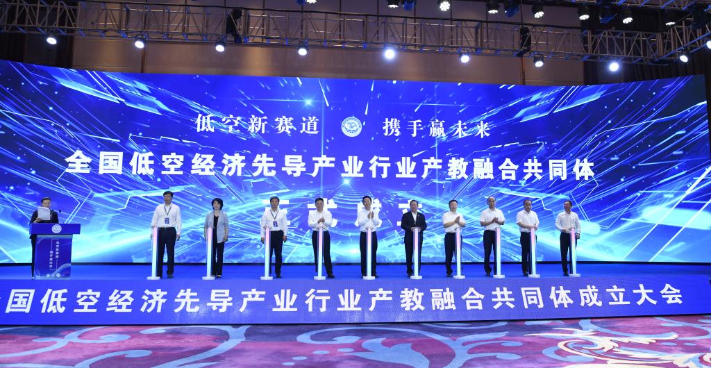 艾学忠与省市领导、企业代表共同按下启动键,标志全国低空经济先导产业行业产教融合共同体正式成立。